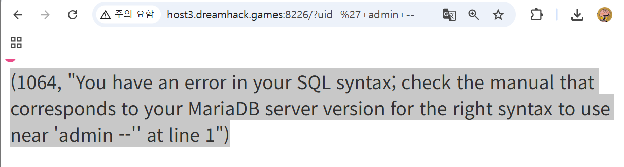 다음과 메시지가 나오는데 SQL 문법 오류라고 뜸. SQL이 실행되기는 한다는 뜻인데 에러를 발생시킴
