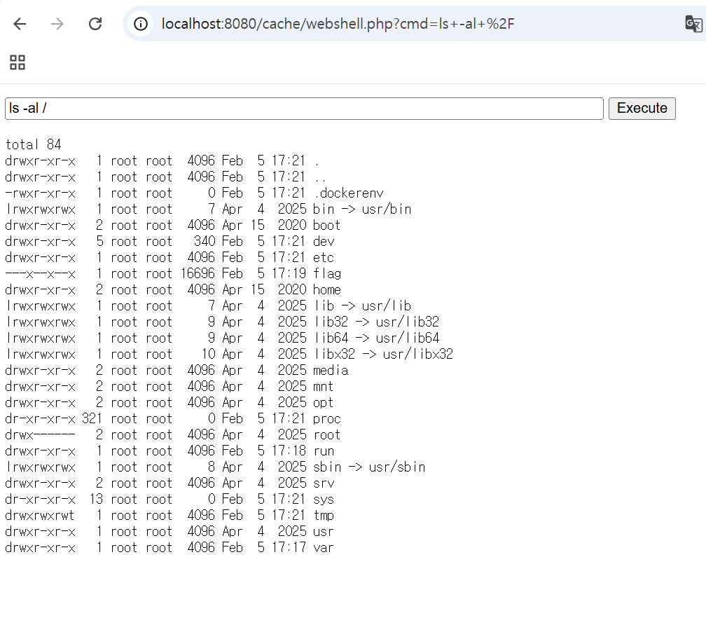 이런식으로 파일이 생기고 URL에 /cache/webshell.php를 입력해 주면