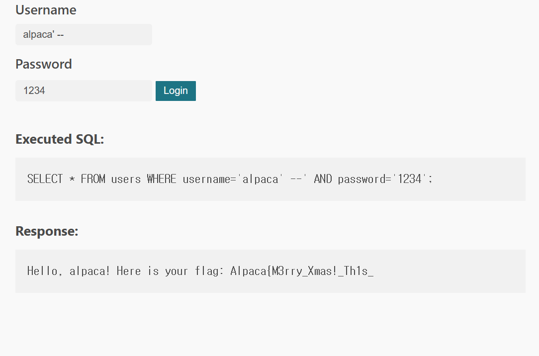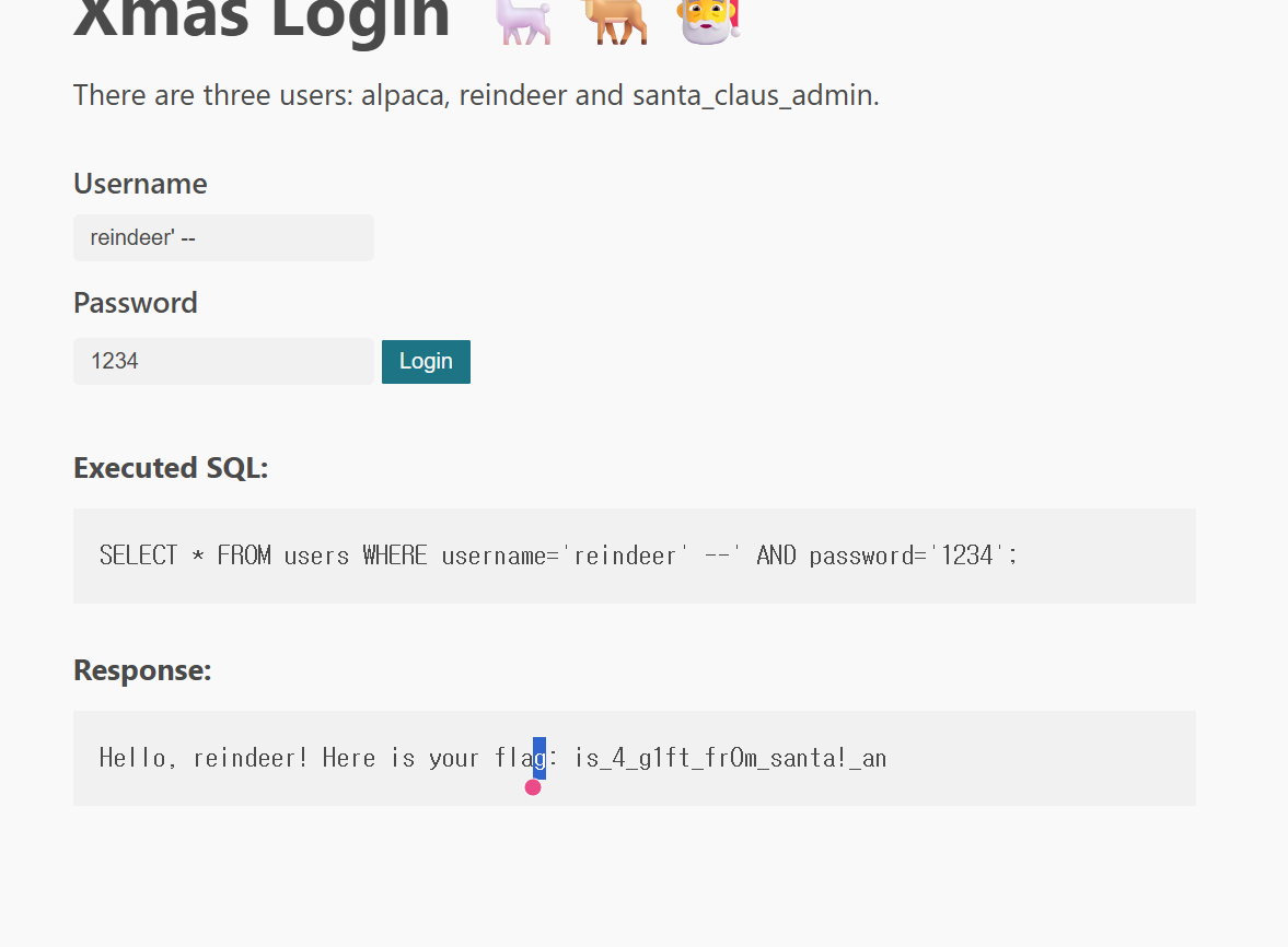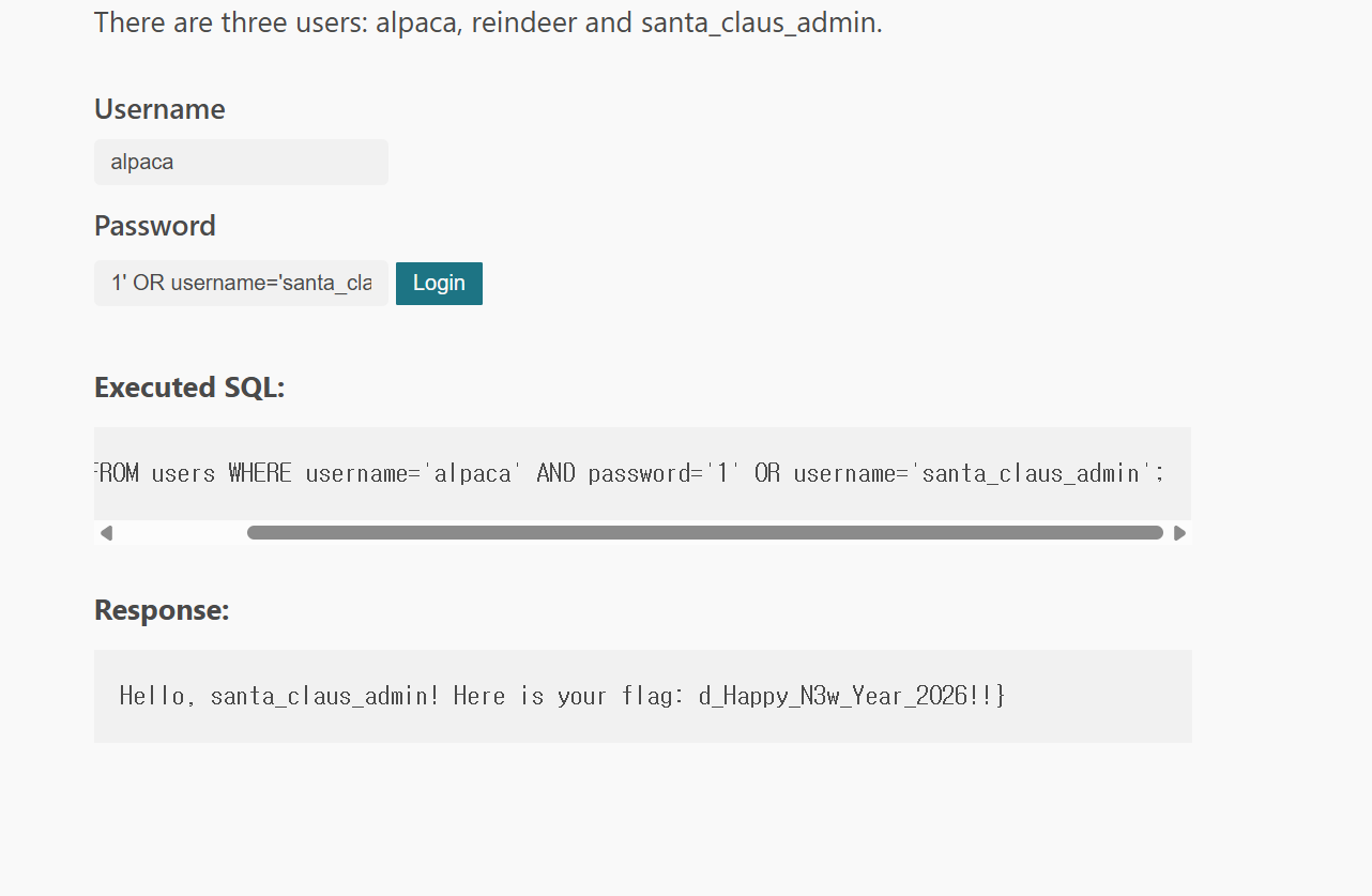 하지만 santa_claus_admin 은 문자열 길이가 12개가 넘어 입력이 안됨 따라서 Username엔 alpaca 써주고 password에 다음과 같이 작성해 줌