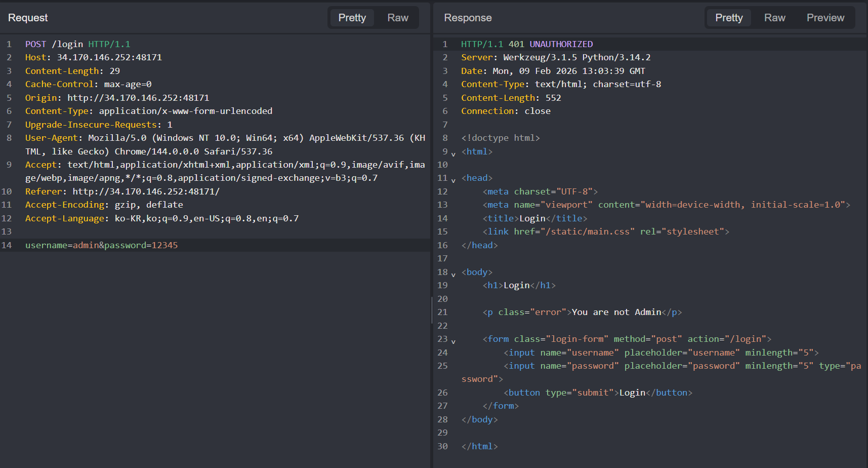 따라서 아까 코드분석에서 username과 password 조건을 확인해보면