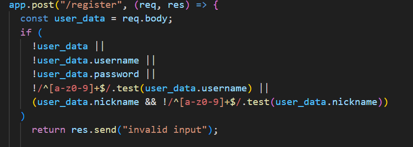 - username, password 존배 여부, username/nickname의 소문자+숫자 검증 후 진행