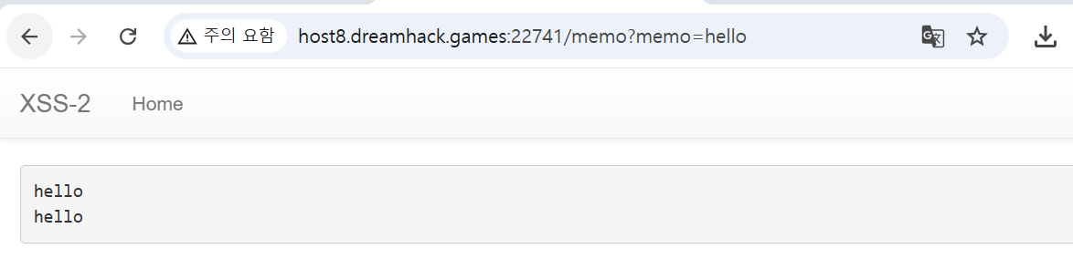 - XSS - 1 과 같이 /memo?memo = hello 가 hello 그대로 메모장에 적혀있는 것을 볼 수 있음